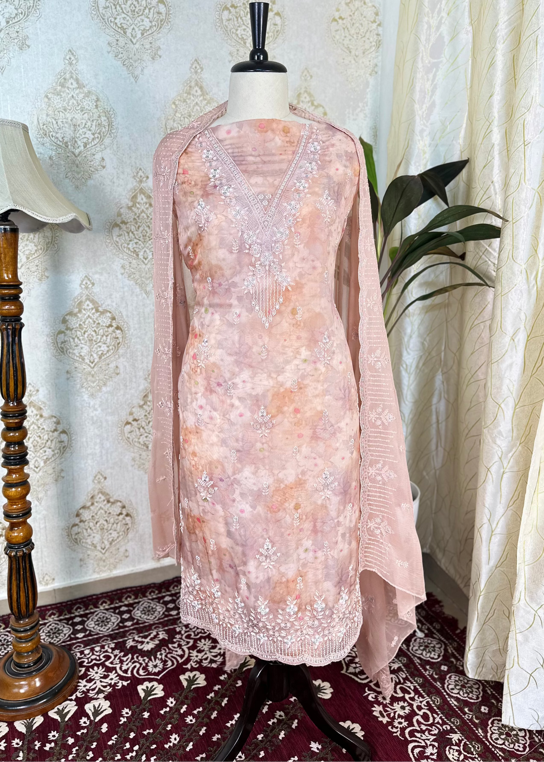 Product Details Peach Color Soft Chiffon Dress Material Refined craftsmanship with hand embroidery, pearl embellishments,...