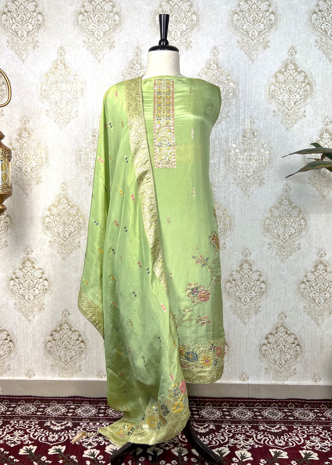 Product Details Green Soft Cotton Dress Material Fine hand embroidery with dabka & pearl detail...